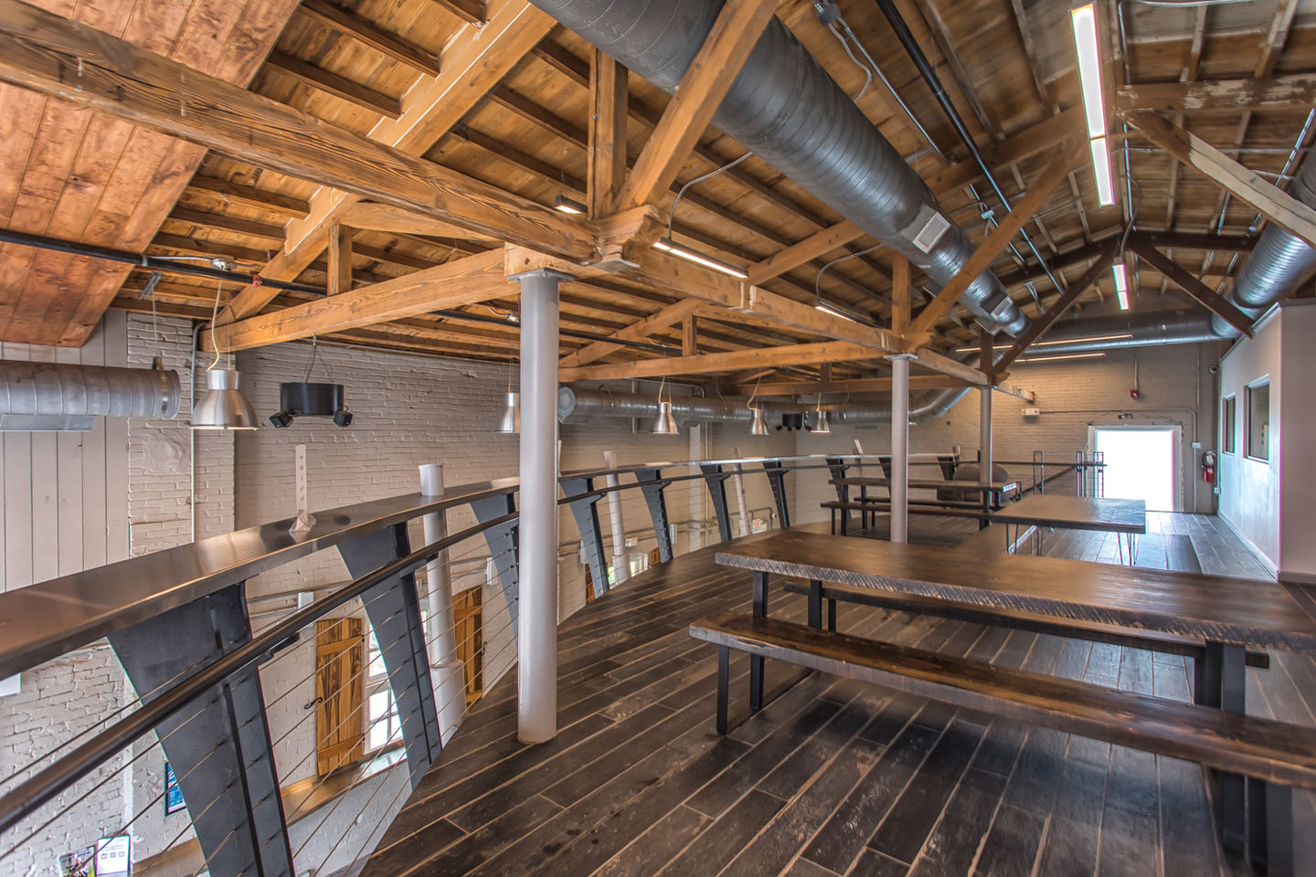 This project was full scale interior renovation of a historic 1907 building built to house fire engines. We maintained the exterior historic facade and added a two story bar area, designed to mimic the front of a ship - to pay homage the pirate Blackbeard aka, Edward Teach. Polished concrete floors and bar top, rope accents and a large brewing area complete the up-fit